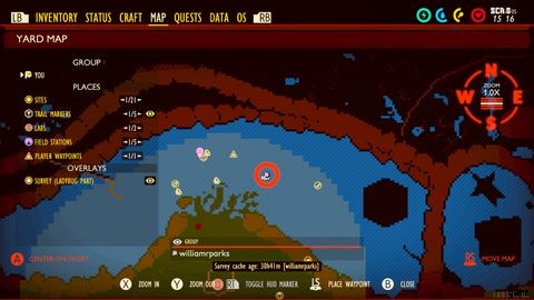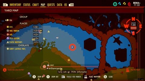 Mossy Key を探しているプレイヤーは、バブル ヘルメット、フィン フロップ、スピア、スライム ランタンを装備することから始めます。これらのファンは、下の地図でマークされている位置に向かい、Grounded に飛び込む必要があります。 の鯉の池 、その地域の魚を避けるように注意してください。プレイヤーがこの位置に降りると、下にあるチューブから泡の流れが上昇するのが見えます。そのチューブをたどって サンケン T-レックス にたどり着く必要があります。 .
