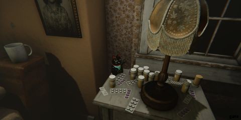 中に入ると、大量のメモと薬が散らばっているため、部屋は混乱しています。この理由は、部屋の右側にあるワードローブを調査することで説明されます (出入り口に立ったとき)。