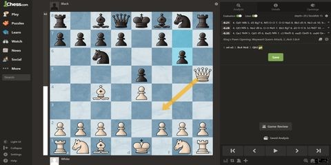 黒はクイーンで学者の仲間を守ることができます。ただし、対戦相手が攻撃してテンポを上げやすいため、チェスの早い段階でクイーンを出すことは一般的に悪い考えです。代わりに、上の画像に示すように、黒は g6 をプレイできます。これにより、クイーンが強制的に移動されます。これは、ホワイトにとって理想とはほど遠いものです。なぜなら、オープニングで同じ駒を 2 回、特にクイーンを動かすと、多くの場合、対戦相手が駒の展開を有利に進められる可能性があるからです。