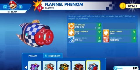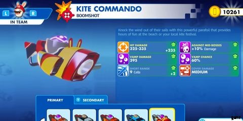 - Despite its less-than-intimidating kite theme, this Boomshot really soars in terms of its strength and added perks. It inflicts 325-335 Hit damage, but most significantly, saps baddies for 395 Vamp damage (60% chance). This is especially great in battle as it yields the dual effect of dealing damage and restoring health to Rabbid Mario. Added to this is an extra 10% damage against mid-bosses, an average range of 9 cells, and medium Cover damage.