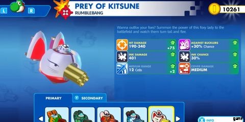 - Referring to a wise, paranormal fox from Japanese folklore, this gatling gun is quite legendary in its own right. It's laced with 190-340 Hit damage and 401 Ink damage (30% chance) for starters. In addition, it adds another 30% chance for Ink damage against the large baddies known as Bucklers. It has a fairly long range of 12 cells and deals medium Cover damage.