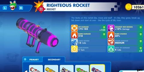 - Players will be making the right choice when equipping Rabbid Luigi with the Righteous Rocket. Its Hit damage stands at a sky-high 175-185, which is augmented with 218 Burn damage (60% chance), and an extra 10% damage against mid-bosses. Added to this is its great coverage; specifically a range of 15 cells, area of damage of 4 cells, and medium Cover damage.