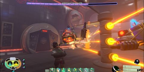 アシスタントの手先をすばやく破壊し、近くで攻撃し、アシスタントの電気弾むボールの攻撃に注意してください。アシスタントは回転するオレンジ色のレーザーもオンにします 飛び越えたり、しゃがんだり、さらにエレクトリックブルーの柱をアクティブにします 各コーナーで重大な損傷を引き起こします。この時点でどちらかの最長の壁の中央に立って、アシスタント マネージャーに近づくことができるまで矢で撃つことをお勧めします。
