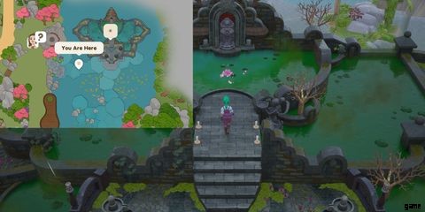 このリラックスできるシミュレーション ゲームのクエスト チェーンの次のステップは、精霊の指示に従うことです。木の精霊は、プレイヤーに湖の神社で島の女神に会うように頼みます。これは、プレーヤーの現在の場所からかなりのハイキングです。マップの北東にずっとあります。湖神社はこんな感じです: