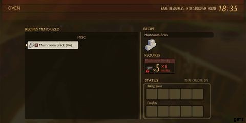 オーブンはキノコレンガと呼ばれる特別な建築アイテムを作るためにも必要です。このレンガは、キノコを分析した後にレシピのロックを解除することで作成できます。レンガはかなり粗く、優れた建築材料ですが、調理するにはオーブンとマッシュルーム スラリーが必要です。つまり、プレイヤーはグラインダーとオーブンの両方にアクセスする必要があります。オーブンは、プレイヤーが特に強力なボスを召喚できるようにする Broodmother BLT と呼ばれる特別なアイテムを調理するためにも必要です。