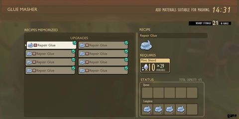 より高いレベルのアイテムを修復するには修復接着剤が必要ですが、プレイヤーがアクセスするにはかなりの時間とリソースが必要です。リペアグルーを作成するには、プレイヤーはまずグルーマッシャーにアクセスする必要があります。 設計図はストアで 500 サイエンスで購入することによってのみロックを解除できます 、でも BURG.L は、プレイヤーが Black Anthill BURG.L チップを回収した後にのみ提供します .このチップを手に入れるには、黒アリ塚研究所を通過し、アシスタント マネージャーと呼ばれるミニボスを倒す必要があります。
