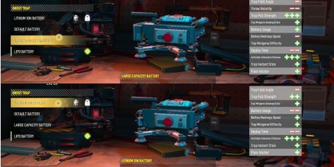 大容量バッテリーは投げるのが重いですが、トラッププル強度とアクティベーション相互作用距離がわずかに強いのに対し、リチウムイオンバッテリーはより多くのバッテリー電力を消費しますが、充電速度は優れています.ただし、後者のロックを解除するには、プレイヤーはトラップ レベル 22 に到達してリチウム イオン バッテリー研究契約を行う必要があり、大容量がよりアクセスしやすい選択肢になります。