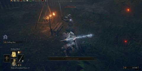 Chilling Mist は Ash of War です。つまり、プレイヤーはこれを近接武器に吹き込み、FP でアクティブ化できる新しいユニークな能力を与えます。起動すると、Chilling Mist はまず、Tarnished の武器を霜で覆います。その後、霜が前方に吹き飛ばされて一斉に攻撃され、刺すような要素が解放され、周囲が厚い霜の雲で覆われます。プレーヤーは、スイープ攻撃が発生する前に照準を合わせて、どこに行くかをある程度制御できます。