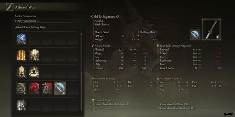 攻撃自体がダメージを与え、敵に霜の蓄積を適用します。それが残した雲は、敵がその中にいる限り、Frost buildup を適用し続けます。使用後、プレイヤーの武器は約 40 秒間氷結したままになり、武器で攻撃を当てるたびに氷結がさらに蓄積されます。このアッシュ オブ ウォーは、プレイヤーがフロストバイトを敵にすばやくスタックするのに最適な方法であり、デバフのおかげで追加のダメージを受けることになるため、ステータス効果の影響を受けやすいボスに対して非常に役立ちます。 Chilling Mist は、キャストするたびに約 14 FP のコストがかかるため、比較的低コストの能力になります。
