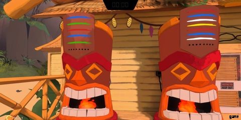 4 つのティキ ヘッドが正しい色でライトアップされると、ゲートが開き、ジュースバーのようなスタイルの小屋が現れます。