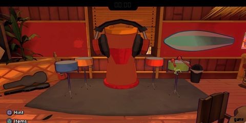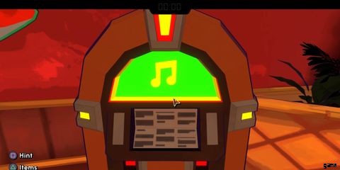 ジュース バー内では、プレイヤーはすぐに多くのことを操作できますが、最初に解決するパズルは、ジュークボックスを操作することから始まります。 4 つの音楽セクションが再生され、それぞれが小屋の反対側にある色付きのドラムに対応します。