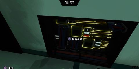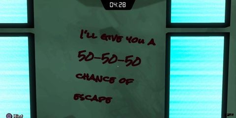 近くの壁に書かれたメッセージを調べて、50-50-50 の確率で脱出できることを伝えます。次に、後壁の中央のスクリーンを調べます。緩んでいて外れて、一連のケーブルと番号が明らかになります。
