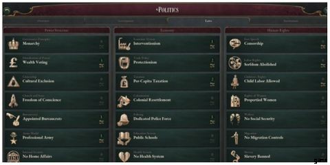 プレーヤーがゲームを開始すると、すべての国は 1836 年に最初にあったものと最も一致する法律で設立されます。どのような条件と戦略が利用可能かなど。ただし、これらの初期の法律は永続的なものではなく、進化するポップのニーズに合わせて変更できます.