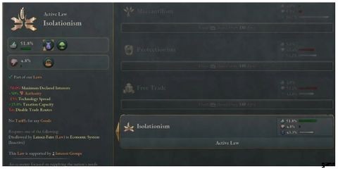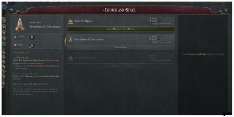 法律には、権力構造、経済、人権の 3 つの主なカテゴリがあります。これらのカテゴリ内には、均等に分割された 15 の法律分野があります。プレイヤーは、最終的に国がどのように機能するかを決定するこれらの領域内でいくつかの選択を行うことができます.政治画面の [法律] タブにアクセスすると、現在施行されている法律を確認できます。ここでは、現在の法律の代替案と、誰がどの法律を支持しているかを確認できます。法律が可決されるためには、政治グループによって承認され、テクノロジー ツリーでロックが解除されなければなりません。