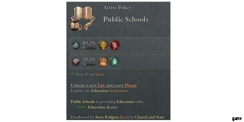 プレイヤーが [法律] タブをチェックすると、[制定] ボタンがグレー表示され、希望する法律を制定できない場合があります。法律が可決されるにはいくつかの前提条件が満たされている必要があり、それらのいずれかがそれを妨げる可能性があります。まず、プレーヤーは、グレー表示されたポリシーにカーソルを合わせて、必要なテクノロジーが不足しているかどうかを確認できます。第二に、すでに相反する法律が制定されている可能性があります。これは、ポリシーにカーソルを合わせると表示されます。