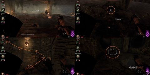 キーを取得したら、前に進み、壁にぶつかるいくつかの岩の横に手押し車を見つけます.プレイヤーは、手押し車から岩へ、次に岩から棚へジャンプすることで、石の垂木へと進むことができます (小さく見えますが、キャラクターは実際にその上を歩くことができます)。次に、兵舎に飛び乗って、前方への唯一の道を下ります。最終的には、最後のグリモアが入った鍵のかかった箱が出口の穴の横にあります.