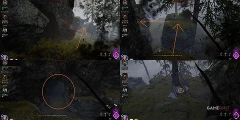左下を見ると、洞窟が見えます。この曲がりくねった道をたどると、グリモアが入った折りたたまれたカードがあります。敵の波が激しくなりすぎた場合は、最高の特性を備えたギアを装備して敵を切り倒してください。