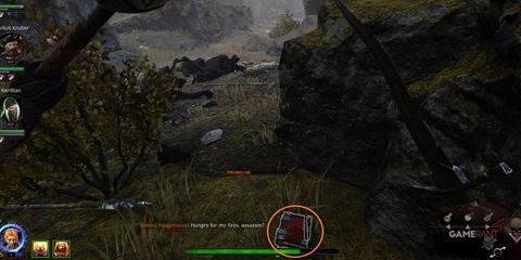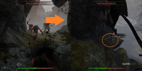 プレーヤーは、画面上のテキストが「Brachsenbrucke, Vorbergland」にいることを示した後、崖の棚を飛び降ります。素朴な茶色の家を見つけるまで道をたどります。鋭く左に曲がって川のそばを見て、最初の書物を見つけてください。
