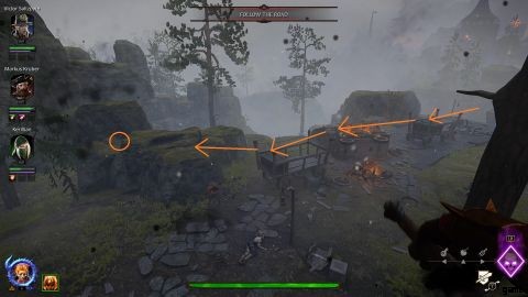 プレイヤーが「Eilhart Road」を見渡すと、焼け落ちたカートの左側にある岩の上に本が見えます。ゲーマーはカートからカートへとジャンプする必要があります。最初は本から最も遠いものから始まり、次に本を持った岩の上に乗ります。