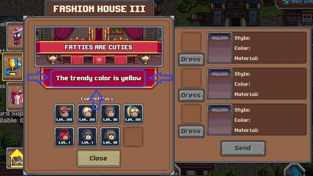 あなたがする必要があるのは、「トレンドカラー」が何であるかを見ることです.その色で3人の仲間を装備し、他の装備は気にしないでください.トレンドカラーだけが重要です。それらをコンテストに送り、簡単に 1 位と 2 位を獲得してください。