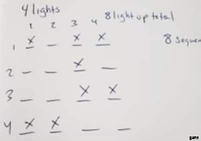 まず、このパズルに取り組む際に人々が抱く最も一般的な仮定について見ていきましょう。点滅するライトのパターンが表示されます。この順序で: