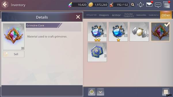 強化素材、石板、魔導書装備製作素材、スキルストーンなど様々なアイテムが収納されています。