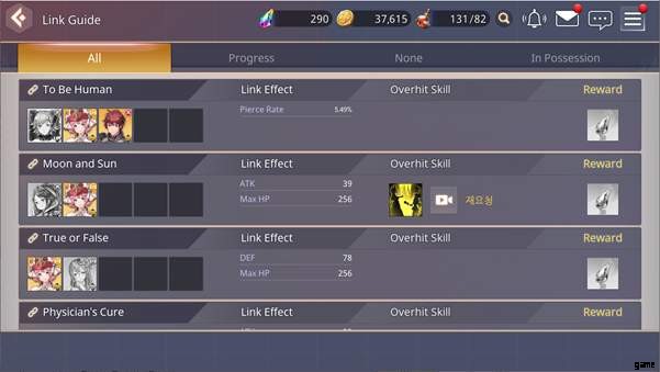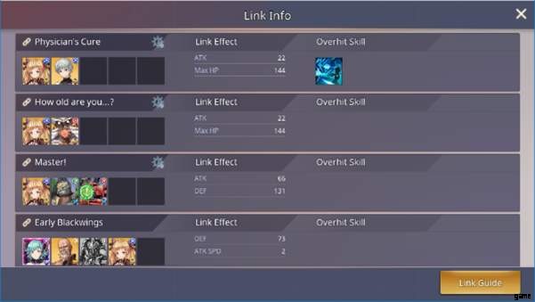 リンク情報では、関連するヒーローにリンクされているヒーローを所有しているかどうかを確認できます。また、リンク効果とオーバーヒット スキル情報も確認できます。