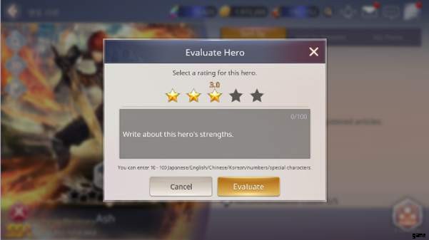 ヒーロー情報の左側にあるヒーロー レビュー メニューをタップして、レビュー画面に移動します。