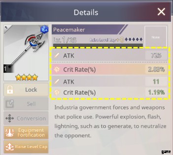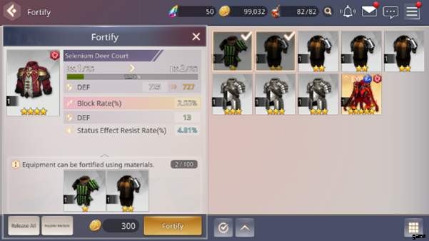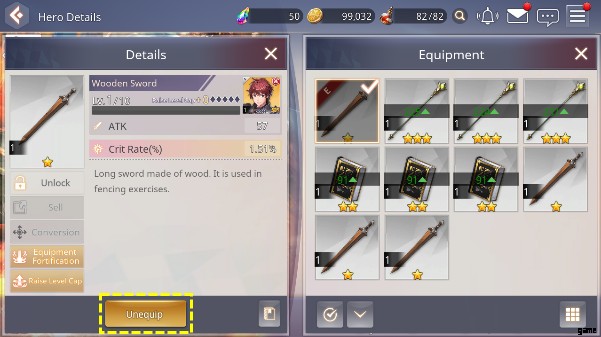 詳細ウィンドウの下部にある装備解除ボタンをタップして、現在のアイテムを装備解除します。右側のリストから装備を選択して、装備を変更できます。