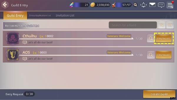 希望のギルドの右側にある [参加申請] ボタンをタップします。ギルド マスターが要求を承認すると、ギルドへの加入が許可されます。