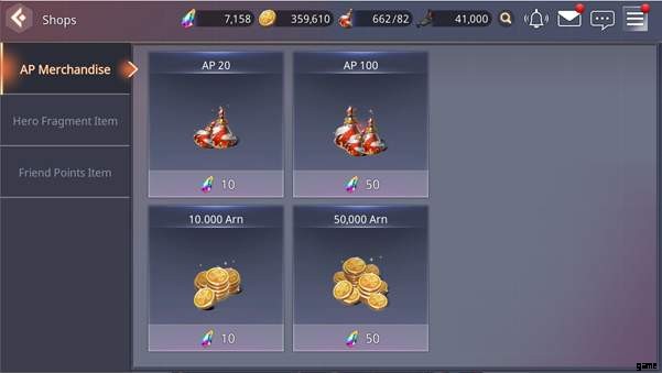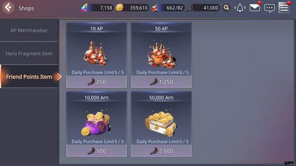 フレンド ポイントを使用して、フレンド ポイント ショップから AP とアーンを購入します。