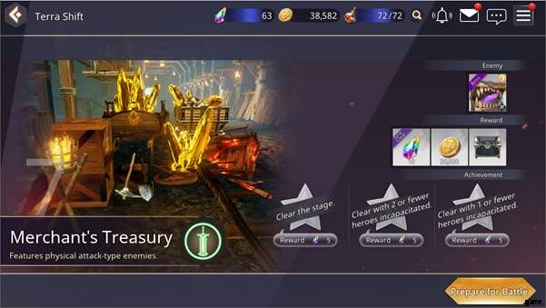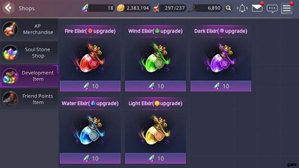 ジェムを使用して火、風、闇、水、光のエリクサーを購入し、ヒーローをアップグレードしてください。