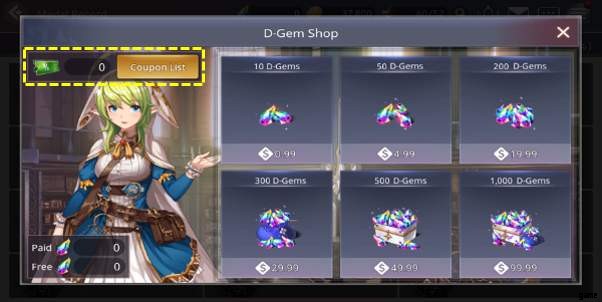 クーポンをお持ちの場合は、Dジェム購入画面からクーポンを選択してご利用いただけます。クーポンで獲得したボーナス D ジェムは、メールボックスに送信されます。