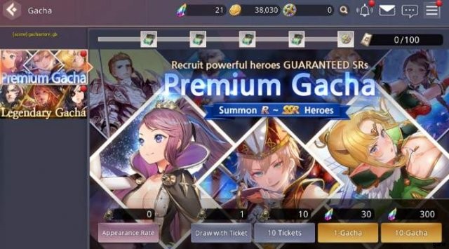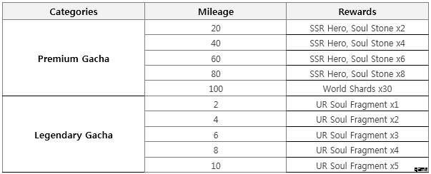 プレミアムガチャ、レジェンダリーガチャ、装備ガチャが登場。 Dジェムでプレミアムガチャや装備ガチャ、ワールドシャードでレジェンダリーガチャを購入できます。ガチャを購入することでマイレージを獲得できます。