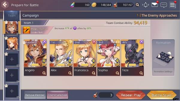EXP 情報、連続戦闘回数、使用 AP 量、ヒーロー リスト、チームのヒーローの空きインベントリ スペースがここに表示されます。