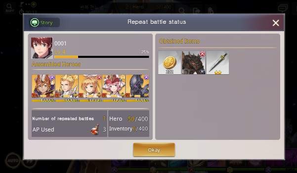 繰り返しバトルは、すべての AP が使用された場合、ヒーロー リストまたはインベントリがいっぱいになった場合、またはバトルに負けた場合に自動的に終了します。その後、繰り返しバトルのポップアップが表示されます。