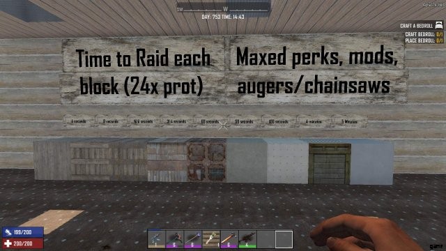 これらは、すべての特典を最大にしてブロックを壊すのにかかった時間です。時間はサーバーの設定に基づいて変化しますが、時間はそれがどれほど簡単かを示す健全な基準になるはずです.スチールはわずか 4 分で開きます。中央に8ブロックの厚さの壁がある特異な部屋を作ると、一人で略奪するのに約1時間かかります.その 16 ブロックの厚さを作るという巨大な作業を行ったとしても、それはわずか 2 時間です。たった 1 人の人間が 12 時間を費やしても基地を理論的に安全にするには、壁の厚さを 90 ブロックにする必要があります!