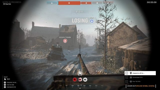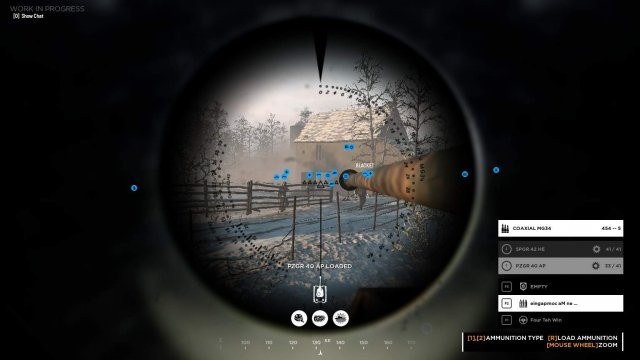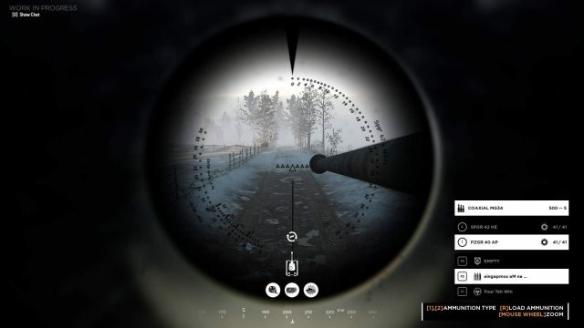利用可能な最高のビュー (マウス ホイールで上下にスクロールしてビューを切り替えたり、ズームインまたはズームアウトしたりできます) で、ステアリングや担当の銃などの実際の機器がないので、最初の仕事はマップを表示して最適な場所を見つけることです。タンクのパス。ペリスコープ シートでは、前方の地形の詳細を呼び出し、ドライバーが適切に操作できるようにドライバーに電話をかけるのに最適です。