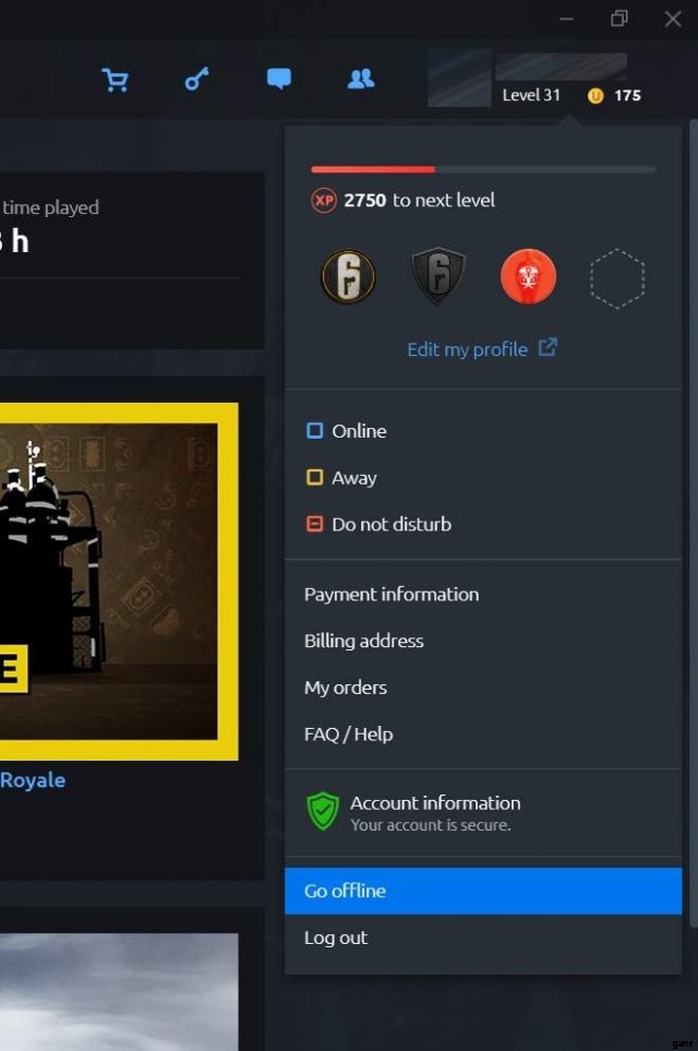 Rainbow Six Siege ゲームが開いている場合は閉じて、Uplay を開きます。そこから、プロフィールがある右上に移動し、Uplay でオフラインにするオプションを選択します。これで、Uplay はオフライン モードになります。