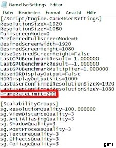 - [/script/engine.gameusersettings] の下のどこかに FrameRateLimit=xxx を追加します。