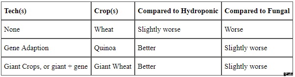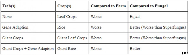 - 真菌農場は実際には酸素を消費し、収量も少ない。ただし、水あたりの収量は最高です (技術者や尖塔を手に入れてドームの水の使用量を減らすまで)。