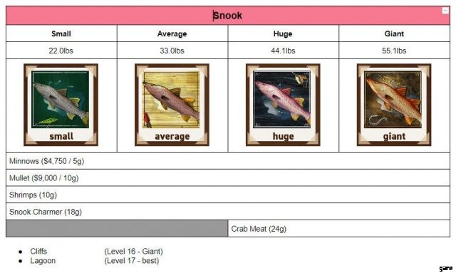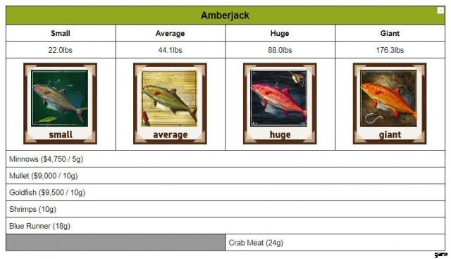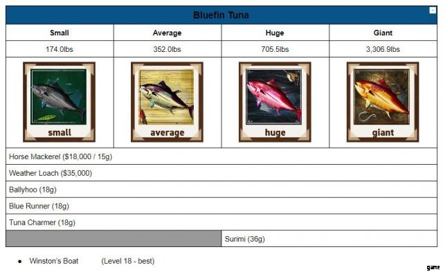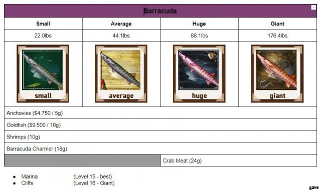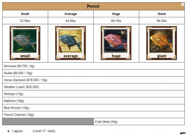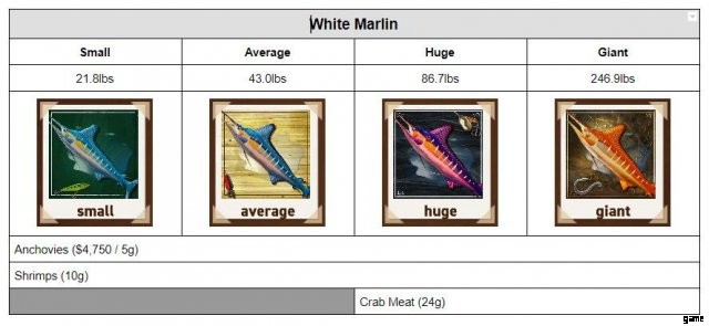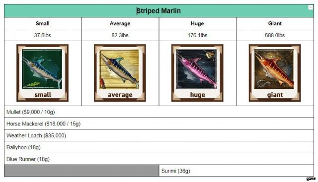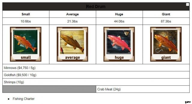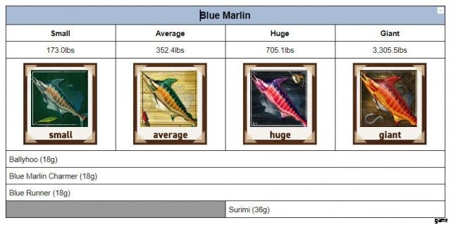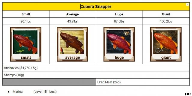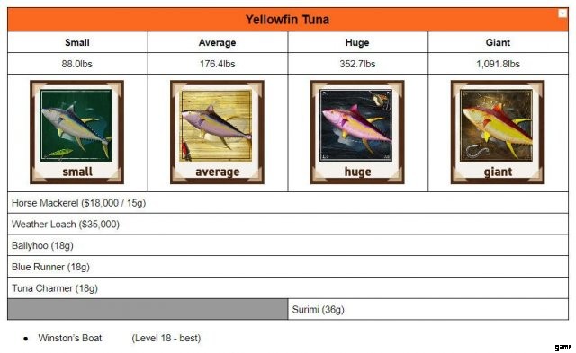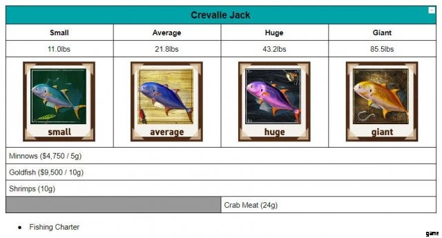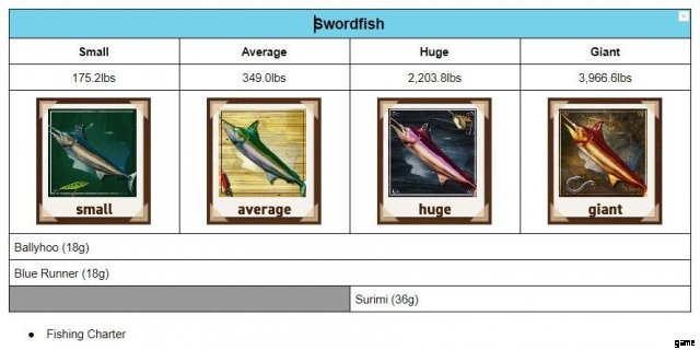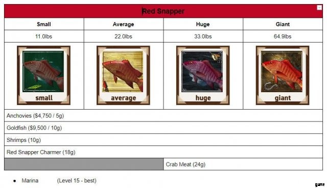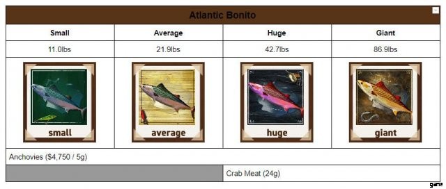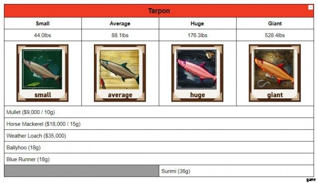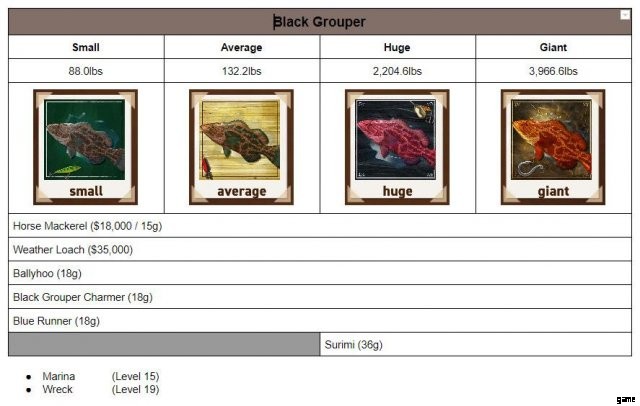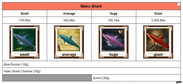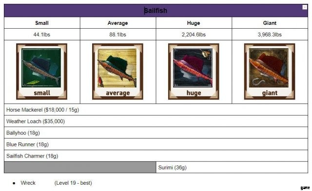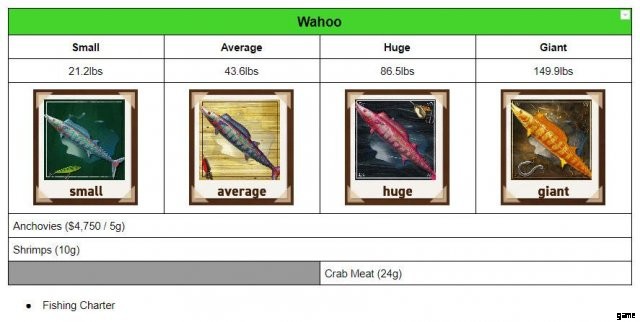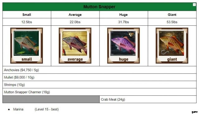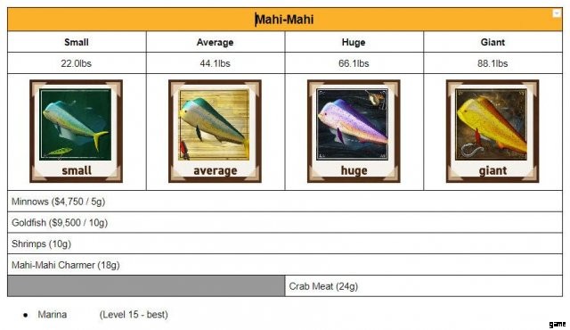 これは、サンマルコスのすべての小さい/平均的な/巨大な/巨大な魚への「スポッターズガイド」です.ゲーム内のフォト アルバムの魚の写真を使用し、各魚のおおよその最大重量、好みの餌、魚が釣れる可能性のある場所を追加します。魚は、Nonchalanto の「Fish Finder Color Charts」に従って色分けされています。