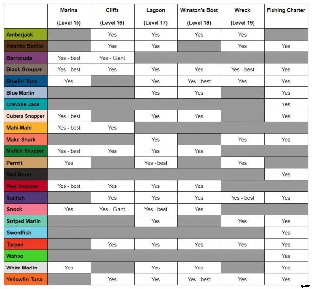 注:与えられた「最高の」魚の位置は、各エリアのゲーム内の説明に基づいています。他のすべての情報は、各種類の魚の最高の漁獲場所に基づいています。そのため、一部の魚は灰色で表示されたエリアでも見つかる可能性があります。