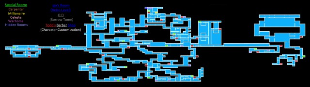 不足している部屋を簡単に確認できるように、ゲーム内のエリアに基づいてマップをセグメント化します。壁を壊すことによってのみアクセスできる隠し部屋は黄色で強調表示されます。