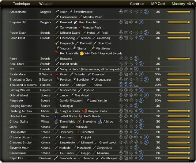 すべてのテクニックと、どの武器がロックを解除するかを一覧表示します。