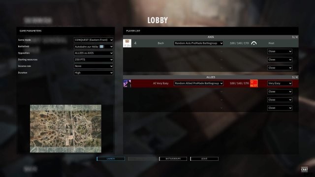 この写真の右側には、LOBBY in White が表示され、次に Player List が表示されます。このフレーズの最後に「Random Axis Premade Battlegroup」という単語が表示され、白い三角形のようなものです。この画面にある他のすべての白い三角形の外観に注意してください。これは、希望どおりに小競り合いを行う方法です。これらの三角形はしばしば下向き矢印と呼ばれ、「ドロップダウン ボックス」をクリックすると表示され、何かを選択できるようになります。コンピューターの専門用語で十分です