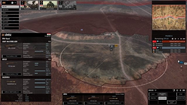 At the bottom right of the screen there is the order window thing next to the word orders there is an iocn looks kind of like and eye or something – click on a unit click on this – if it is an infantry unit it may need to be out of the truck – anyway click on a unit and click on this. You will see your units line of sight according to the location it is in at that precise moment so do this when a unit is stopped. The darker areas are the areas that the unit cannot see. Also and very important is the shaded circle line that is shown this is the range of the unit how far away it can fire at stuff. Units having multiple weapons makes this a little tricky. This line is the range of the weapon that this unit has that can shoot the most far. For example, click on an infantry unit it would be nice if this infantry unit has a bolt action rifle, a tommy gun type weapon, and a bazooka type weapon all these have 3 different distances. So you click on the infantry unit it shows a circle with the number 500 m – notice the screen below:
