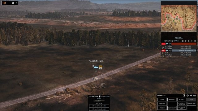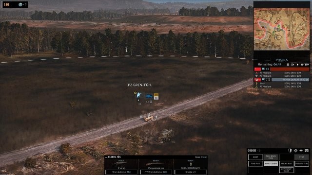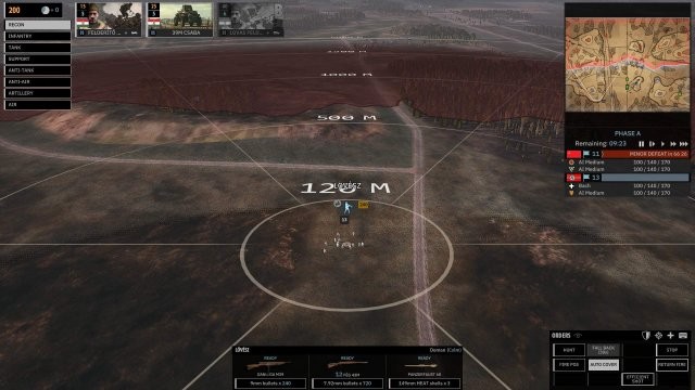 This screenshot shows I have finally clicked on my tank notice the info box below showing the two guns this tank has so I get more info so hear I can press H and click on the main gun and keep it from firing endlessly at infantry and just let the tanks machine gun suppress and take out the infantry if so desired.