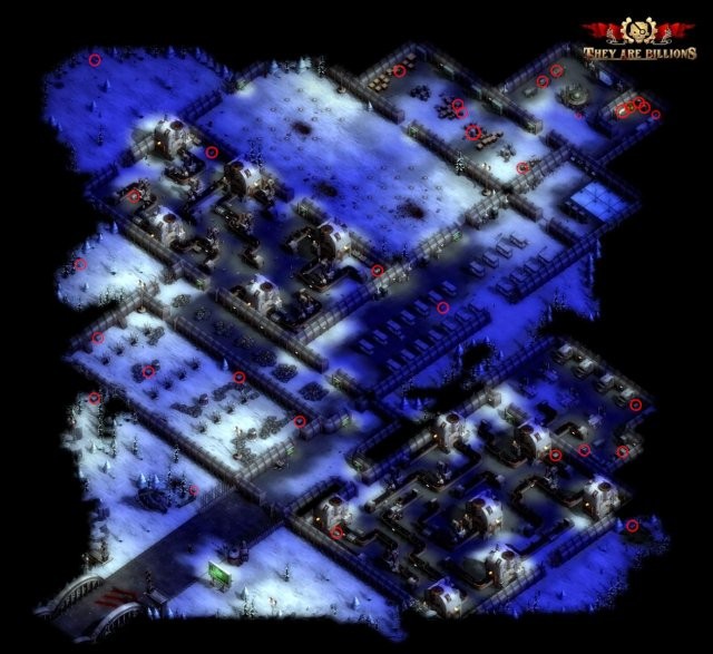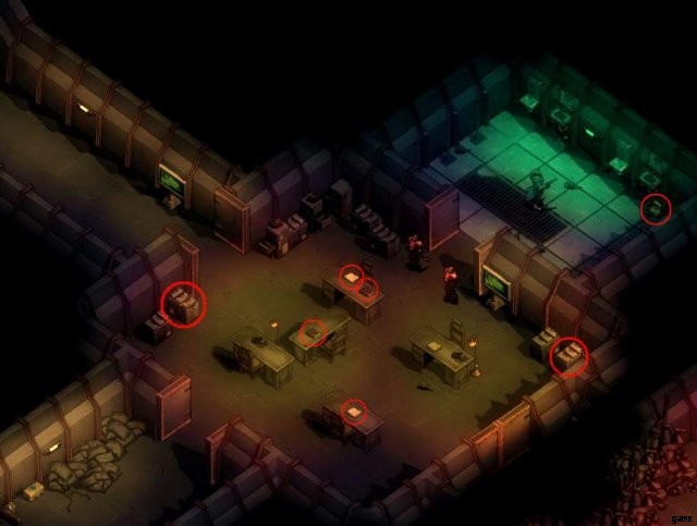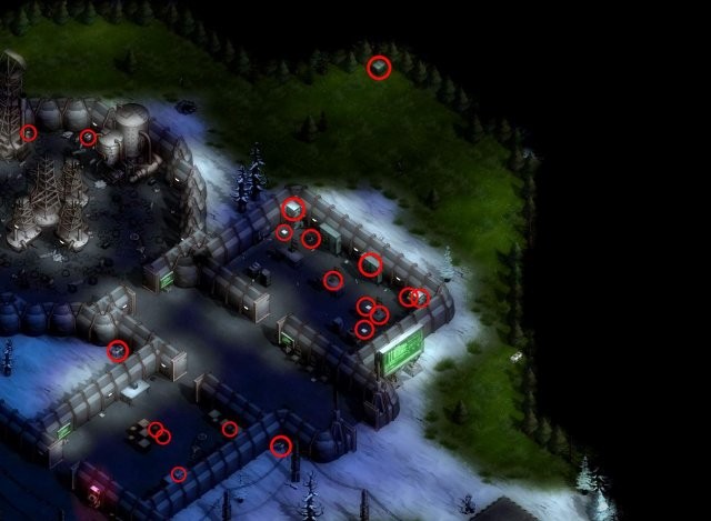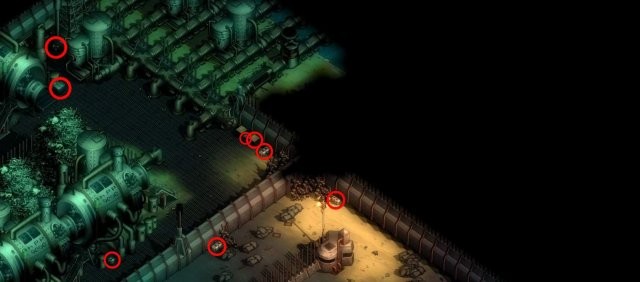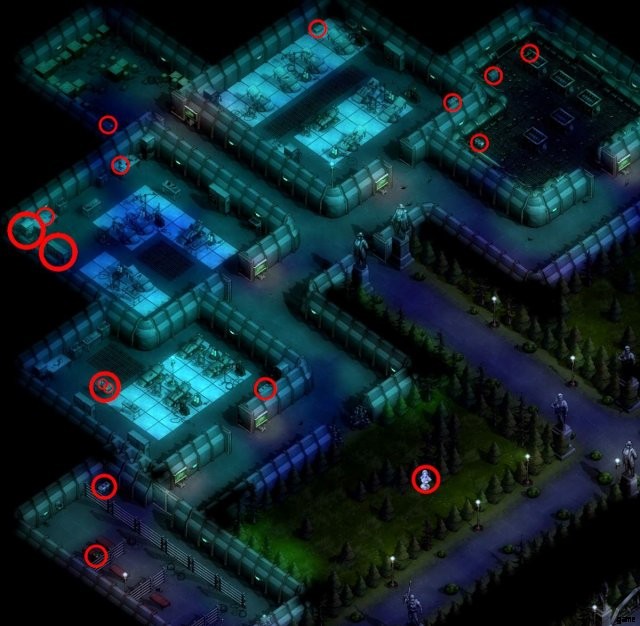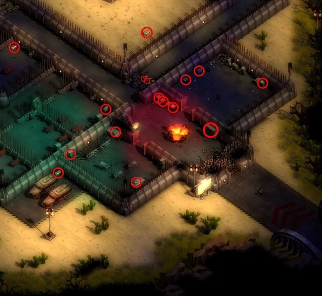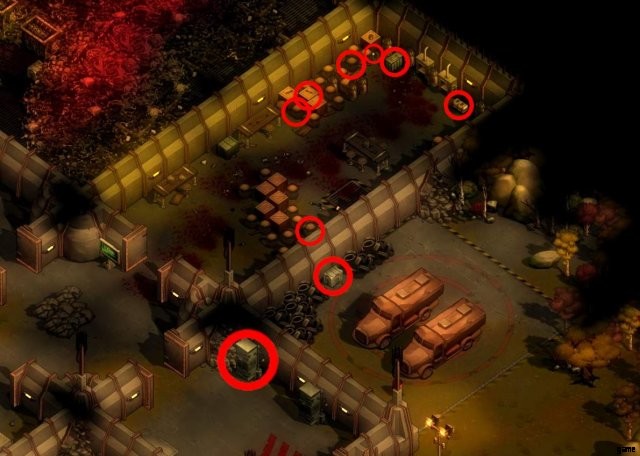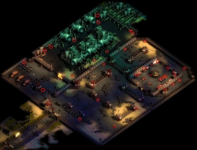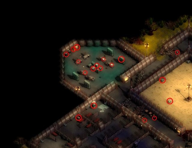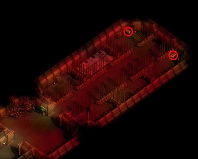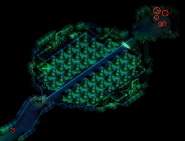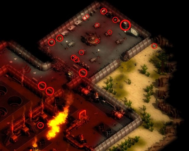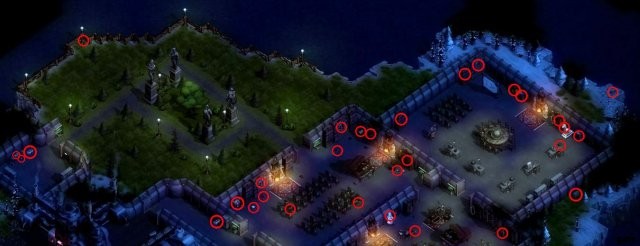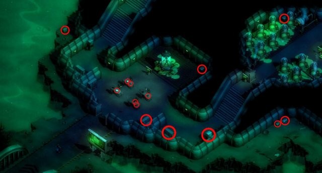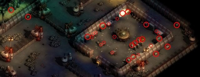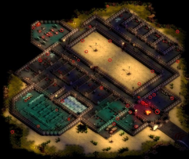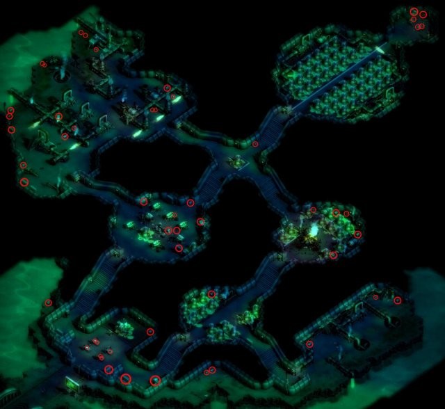 レベルの概要 (赤い丸は収集品/消耗品です)。