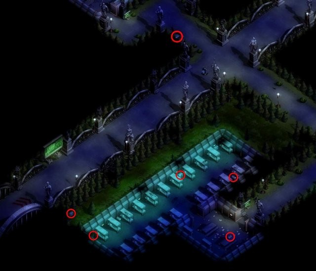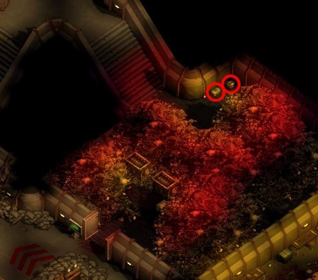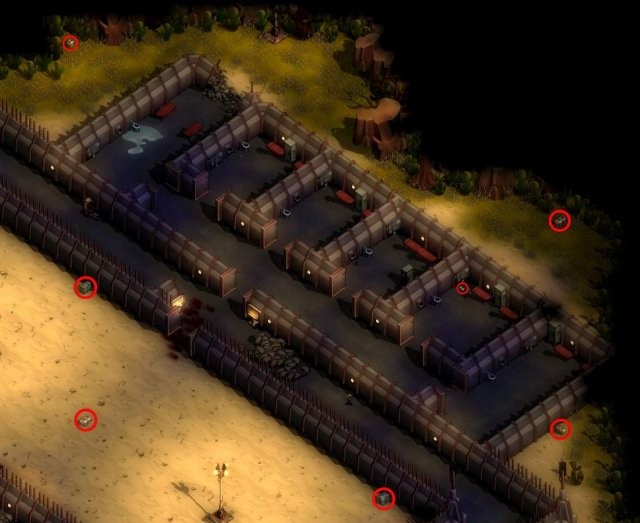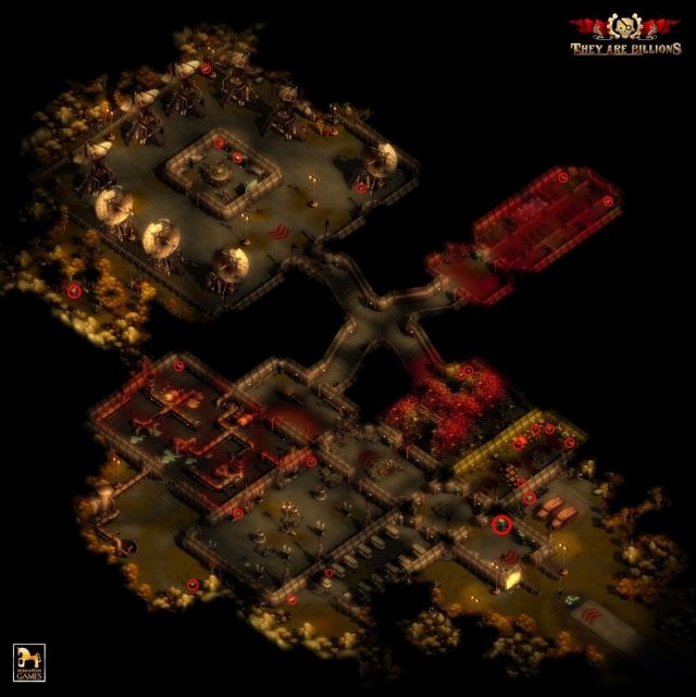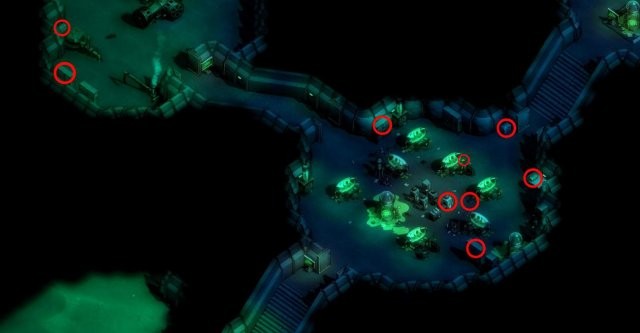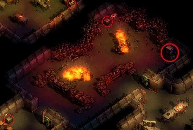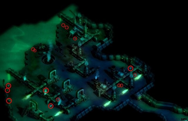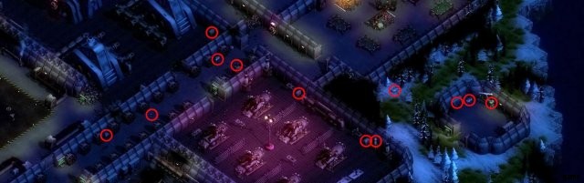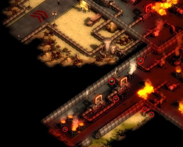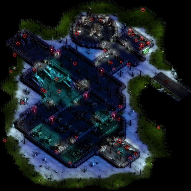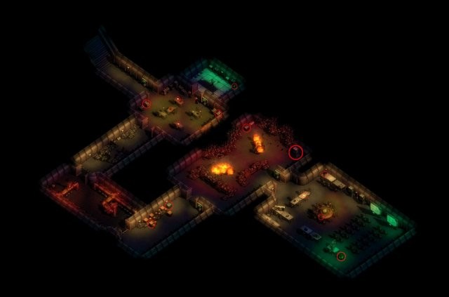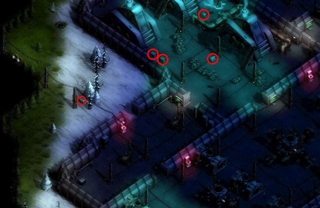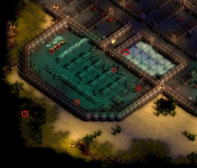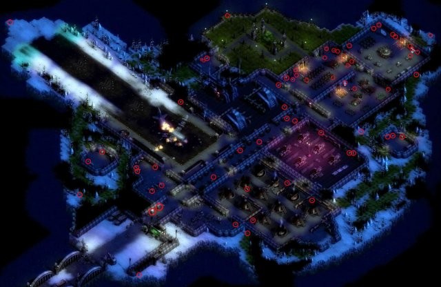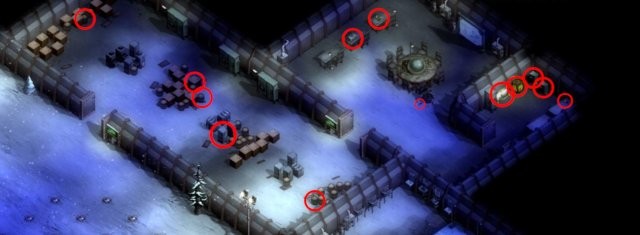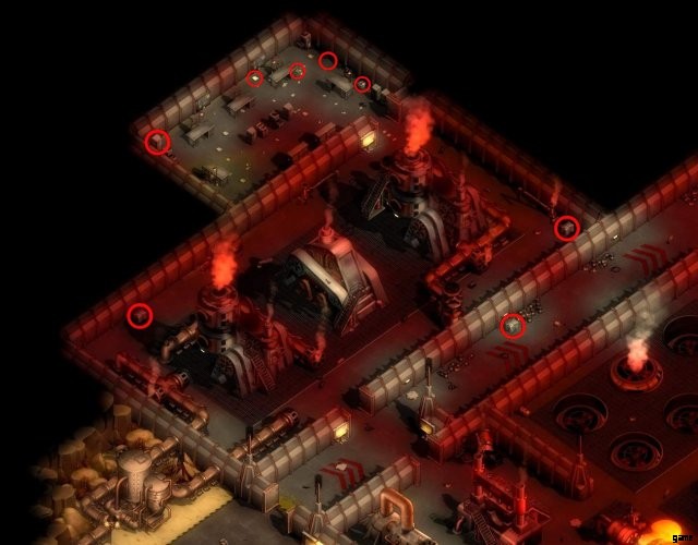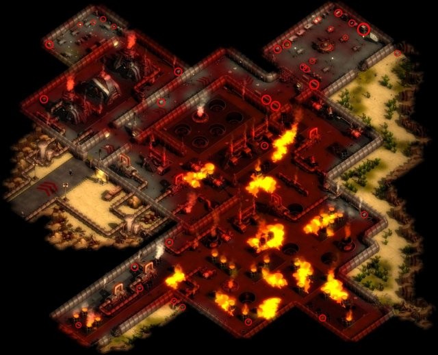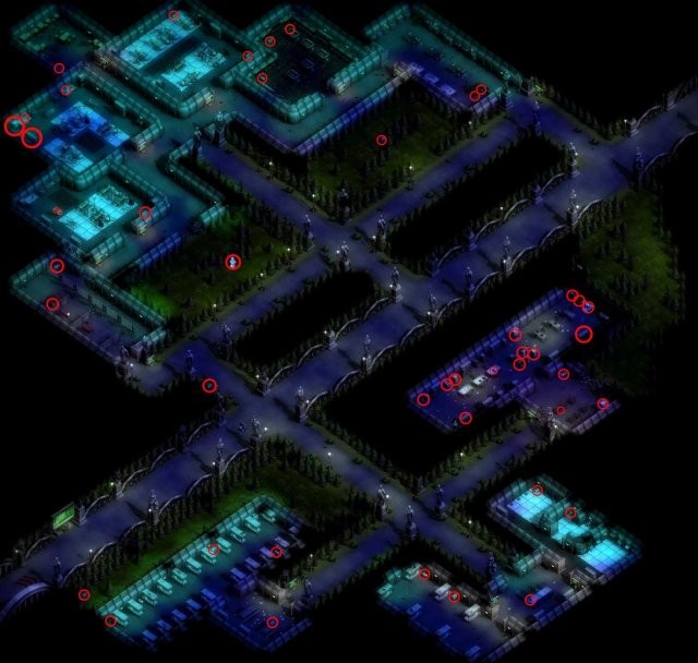 レベルの概要 (赤い丸は収集品/消耗品です)。